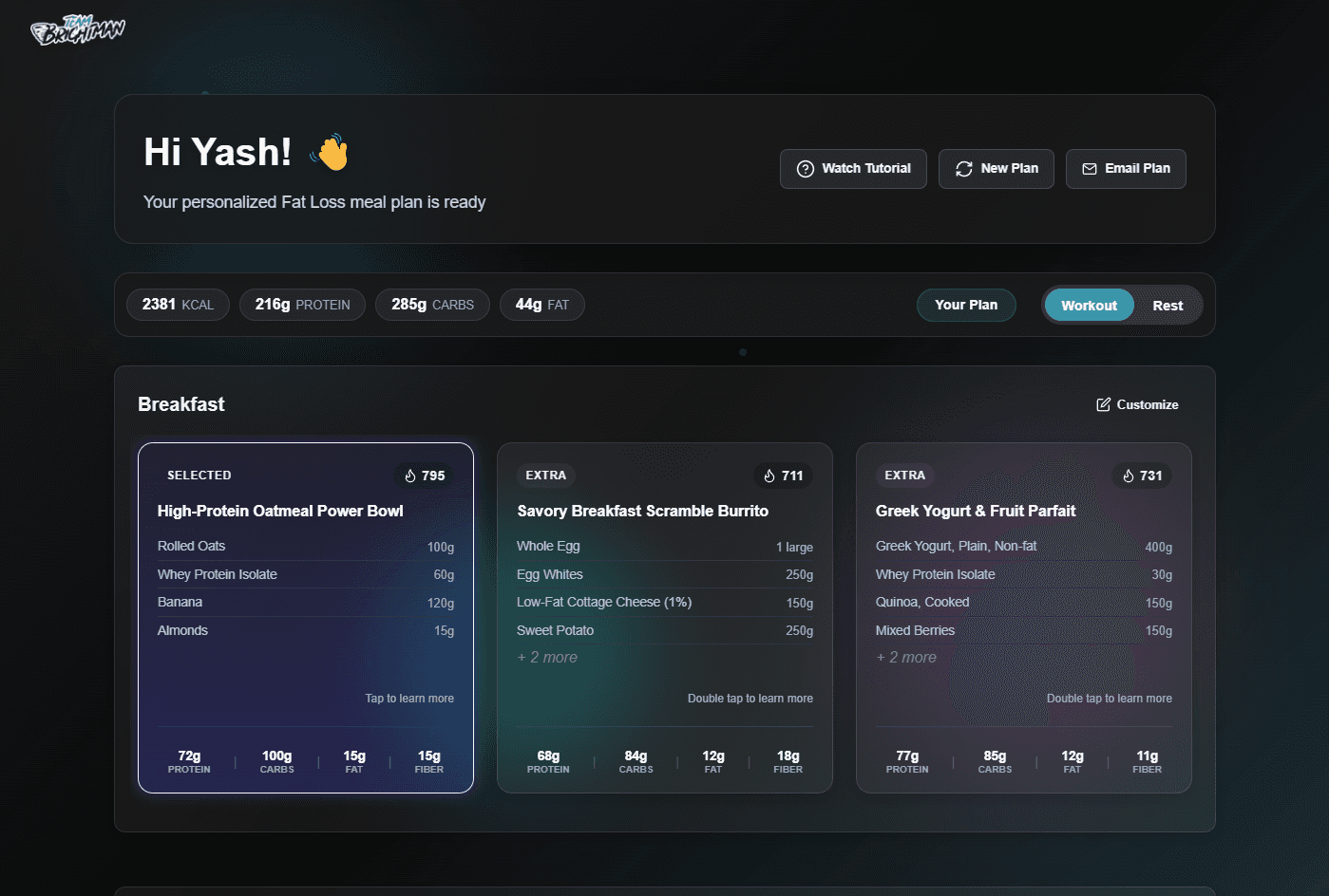 We built an AI-powered meal planner using Google Gemini. Users go through a quick onboarding — age, weight, activity level, goals (fat loss, muscle gain, maintenance), and dietary preferences. The AI generates a full week of calorie-targeted meals with exact macros. Every meal can be swapped or regenerated through an AI chat interface. Multiple weeks generate in the background so the plan is always ready. Rate limiting and model failover keep it reliable at scale. Plans are emailed directly with grocery lists and prep guides.