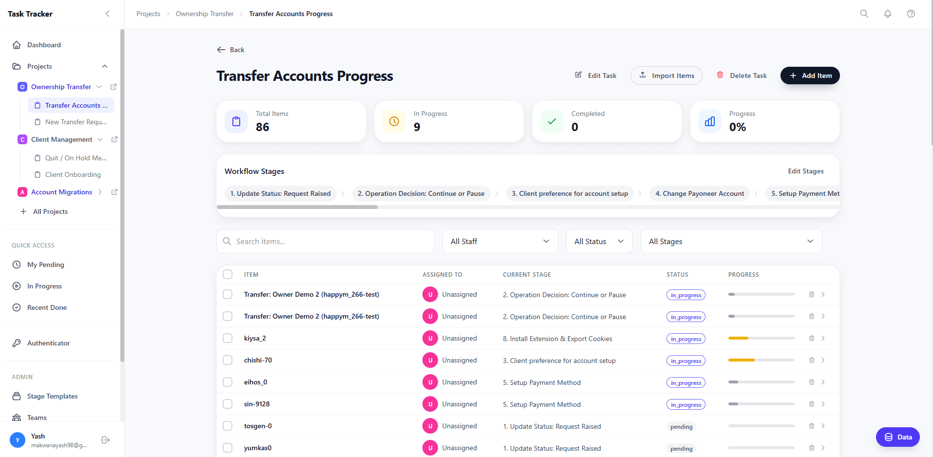 Our client was managing account transfers, client onboarding, and internal processes across spreadsheets and email threads. Each process had different stages, different people involved, and no visibility into where things were stuck.