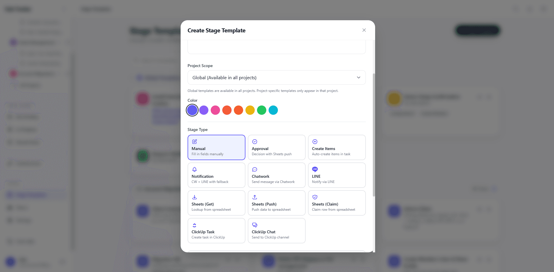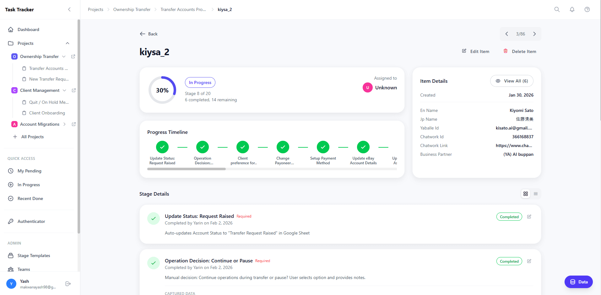 Task Tracker gives every project a configurable workflow pipeline. Stage templates let you define reusable workflows — manual stages, approval gates, notifications, Google Sheets sync, and ClickUp integration. Each item moves through stages with a visual progress timeline showing exactly what's done and what's next. The dashboard surfaces pending items, in-progress work, and recent completions at a glance. Teams see their assigned work, managers see the full picture.